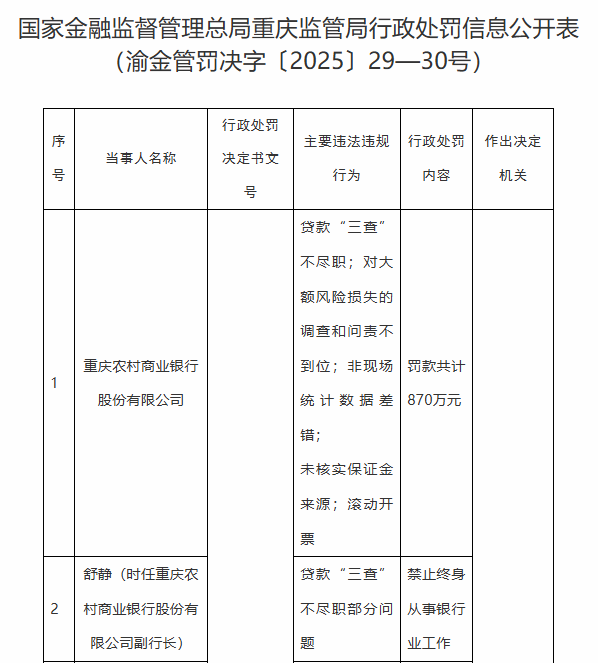 中国经济网北京12月26日电:国家金融监督管理总局25日发布《重庆市监管局行政处罚信息公示表》(渝金监管决字[2025]29号)。重庆农村商业银行股份有限公司(以下简称“重庆农村商业银行”,601077.SH)存在以下违法事实:未对贷款“三检”尽职尽责;对重大风险损失的调查和责任不充分;场外统计数据错误;未能验证保证金的来源;和滚动发票。舒静(时任重庆农村商业银行股份有限公司副行长)、冯宏伟(时任重庆农村商业银行股份有限公司贷款审核主任)、彭涛(时任重庆农村商业银行股份有限公司公司业务部总经理)、商业银行股份有限公司公司部曾长勋。有限公司)、张崇义(时任重庆农村商业银行股份有限公司九龙坡支行行长)、李欢(时任重庆农村商业银行股份有限公司公司业务部总经理)、重庆农村商业银行股份有限公司九龙坡支行副行长、重庆农村商业银行股份有限公司总经理、重庆农村商业银行股份有限公司审批部)、沉涛(时任巴南分行行长)重庆农村商业银行股份有限公司副行长黄玉祥(时任重庆农村商业银行股份有限公司江北分行副行长)、崔岩(时任农村商业银行股份有限公司副行长)、崔岩(时任农村商业银行股份有限公司副行长)存在以下违法违规事实:贷款“三检”不尽职。重庆金融监管局决定对重庆农村商业银行股份有限公司、班舒静、冯宏伟处以罚款共计870万元对彭涛、曾长勋、张崇义、Y0征、张0元、Y0征5人分别处以警告、并处5万元罚款,对李欢、黄玉祥、崔艳给予警告。 2016年2月15日,重庆市监察局对舒静、刘江桥的任职资格作出核准(渝银监复[2016]4号)。根据《中国银监会农村中小金融机构管理办法》《许可事项实施办法》(中国银监会令2015年第3号)等相关规定,经重庆银监局审核,舒静、刘江的任职资格建议聘任如江为舒静、刘江行长。获批设立商业银行股份有限公司。界面新闻报道《重庆农商行被罚870万元,原副行长、贷审长被终身禁止从事业务”显示,2024年3月28日,重庆农商银行董事会决定免去舒静该行副行长职务。一天后,据重庆市纪委监委通报,重庆农商银行原党委委员、副行长舒静涉嫌严重违纪违法,目前正在接受重庆市纪委纪律审查和监察调查。当年8月,舒静被开除党政职务。 原文如下: